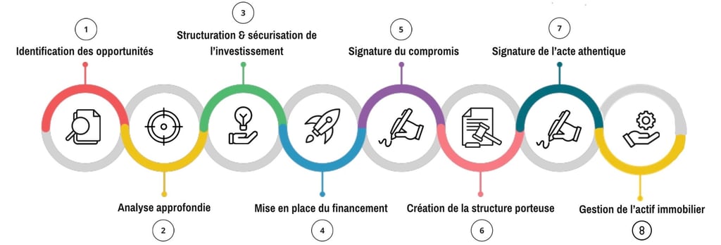 1. Identification des opportunités: sélection d’actifs immobiliers à fort potentiel de valorisation, principalement dans le secteur tertiaire.